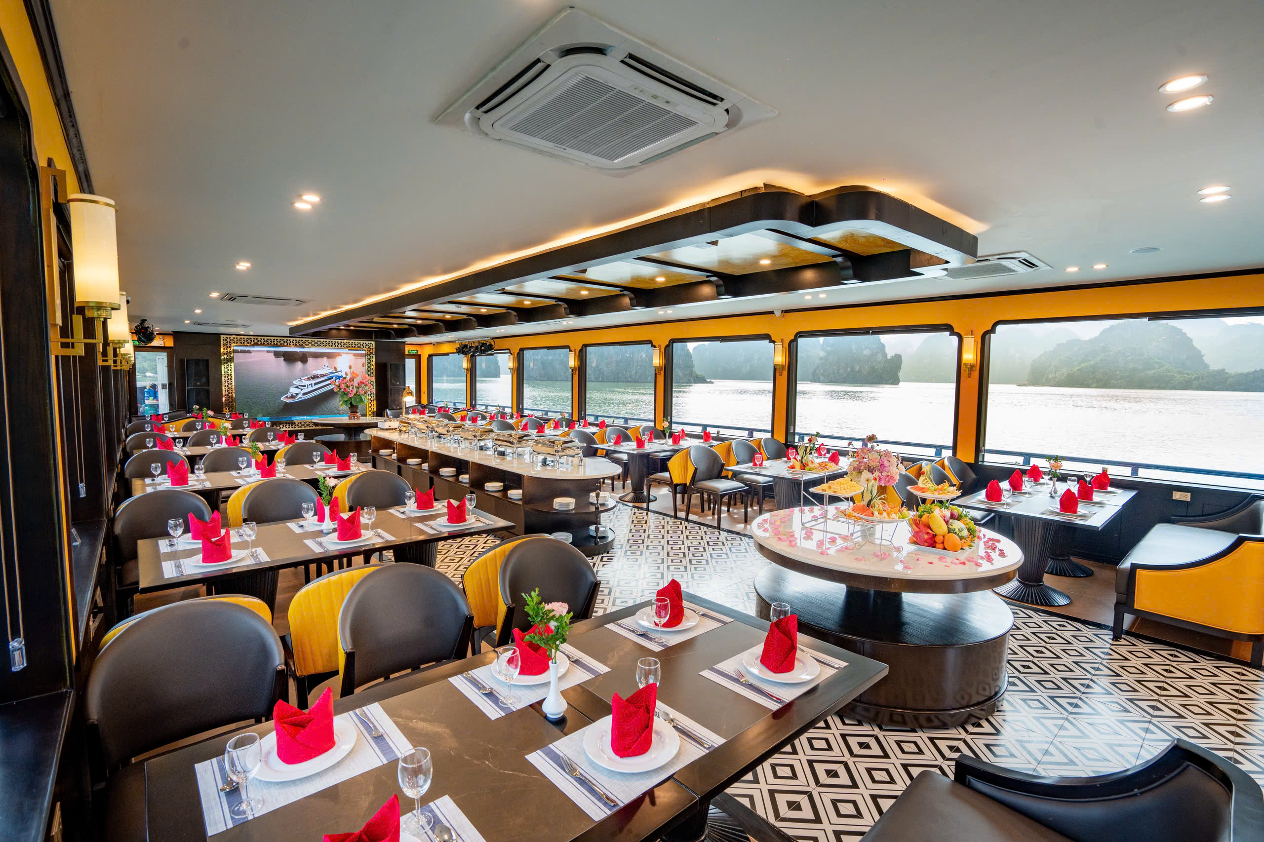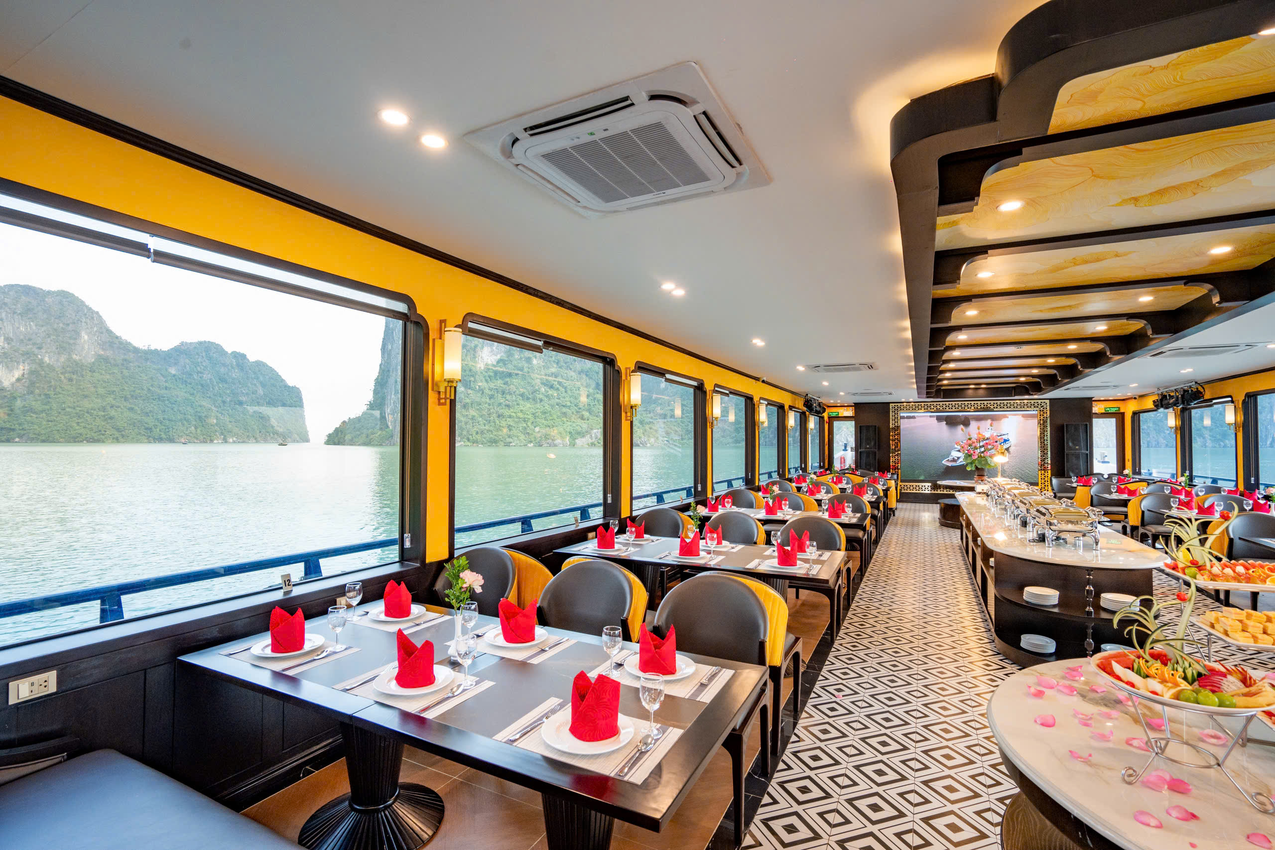 12h30: Quý khách thưởng thức bữa trưa trên tàu. Quý khách có thể vừa thưởng thức các món ăn, vừa ngắm nhìn cảnh vịnh hai bên với hàng ngàn hòn đảo lớn nhỏ khác nhau từ nhà hàng trên tàu.