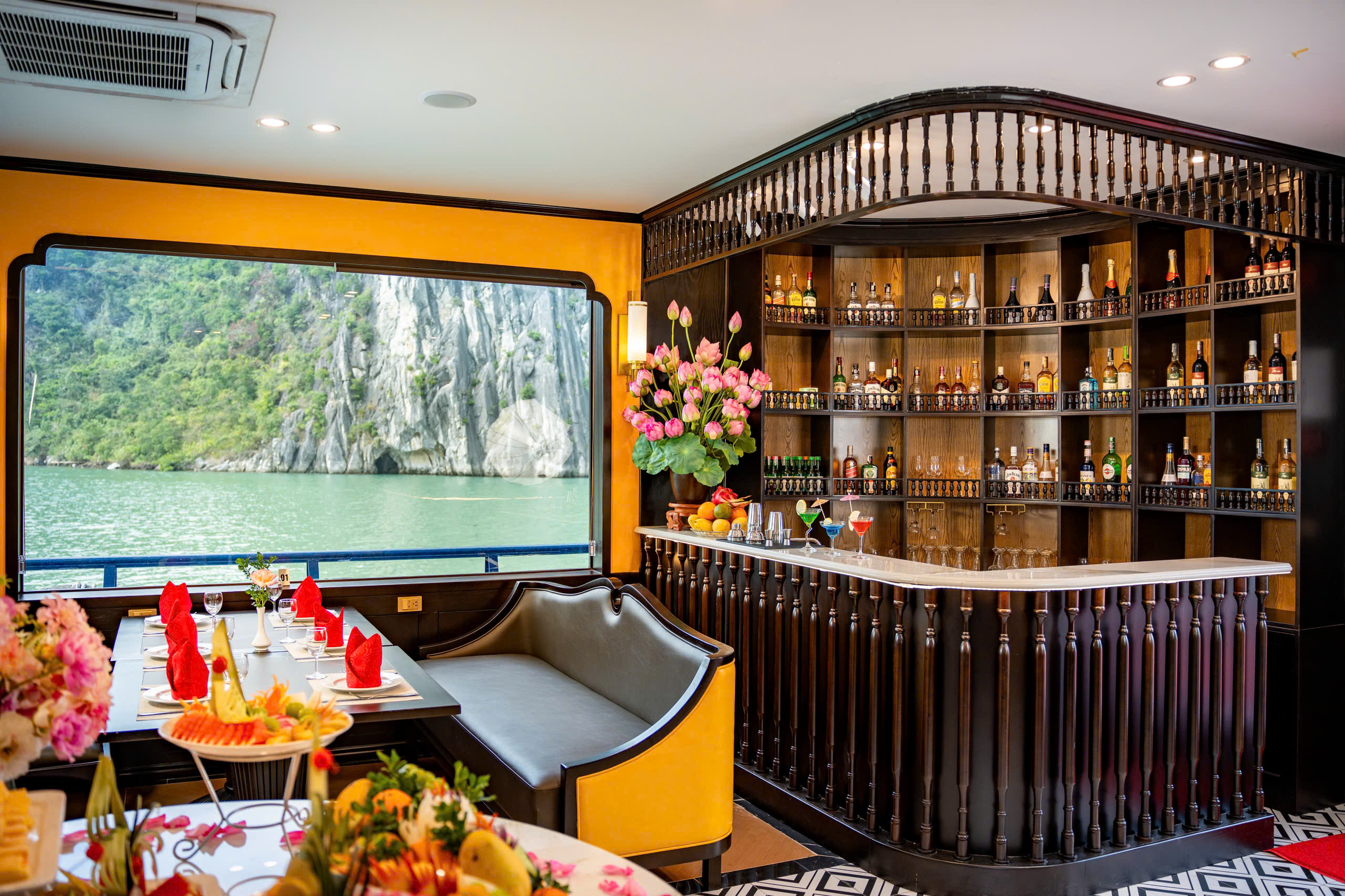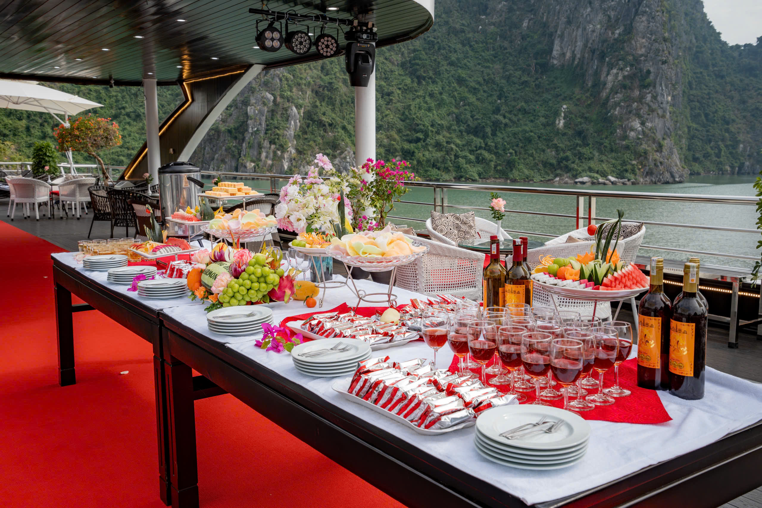 16h30: Quay trở lại tàu để thưởng thức tiệc sunset ngắm hoàng hôn, nhâm nhi 1 chút rượu vàng cùng hoa quả thư giãn trong khi tàu trở về bến Tuần Châu.