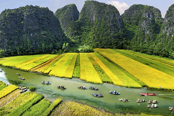 13h30: Lên thuyền khám phá Tam Cốc (Hang Cả, Hang Hai, Hang Ba). Du khách sẽ được ngồi thuyền nan dọc sông Ngô Đồng, ngắm cảnh đồng lúa, núi đá vôi và chiêm ngưỡng những khối thạch nhũ kỳ ảo trong hang động.